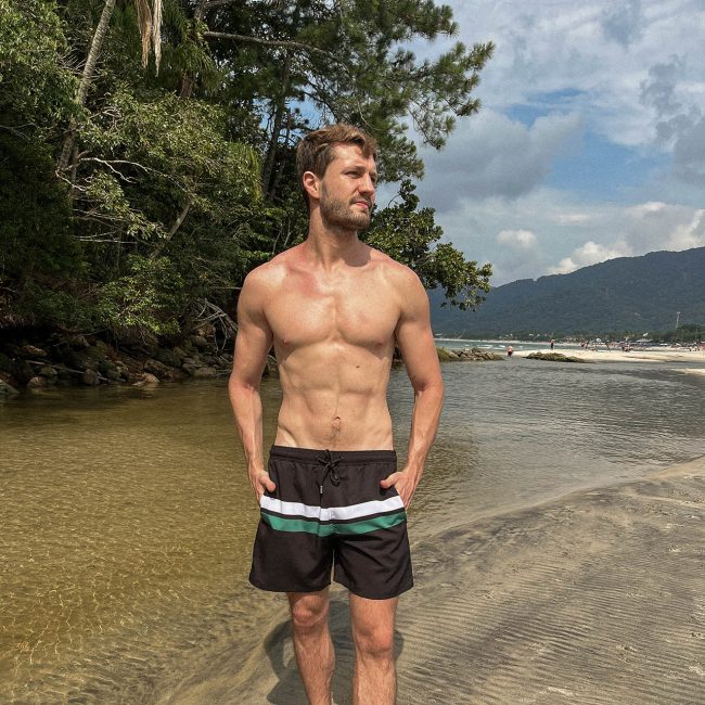 O modelo tem 1,79m de altura, pesa 76kg e veste tamanho P.