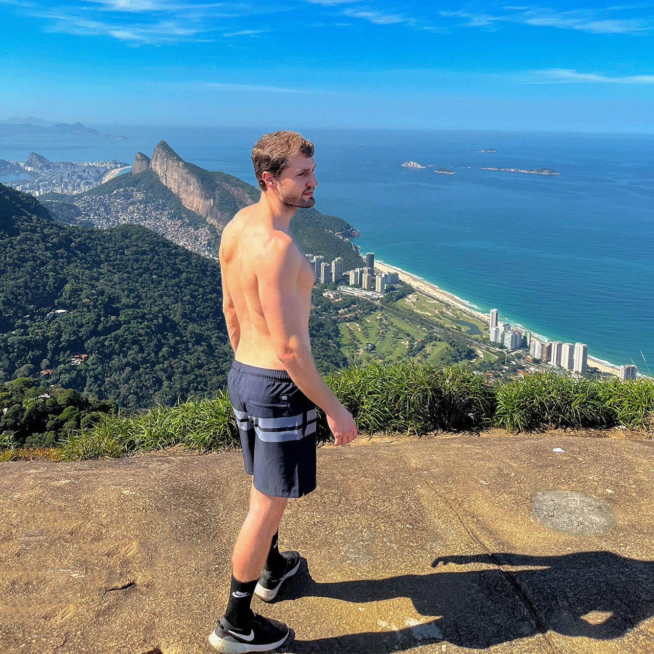 O modelo tem 1,79m de altura, pesa 76kg e veste tamanho P.