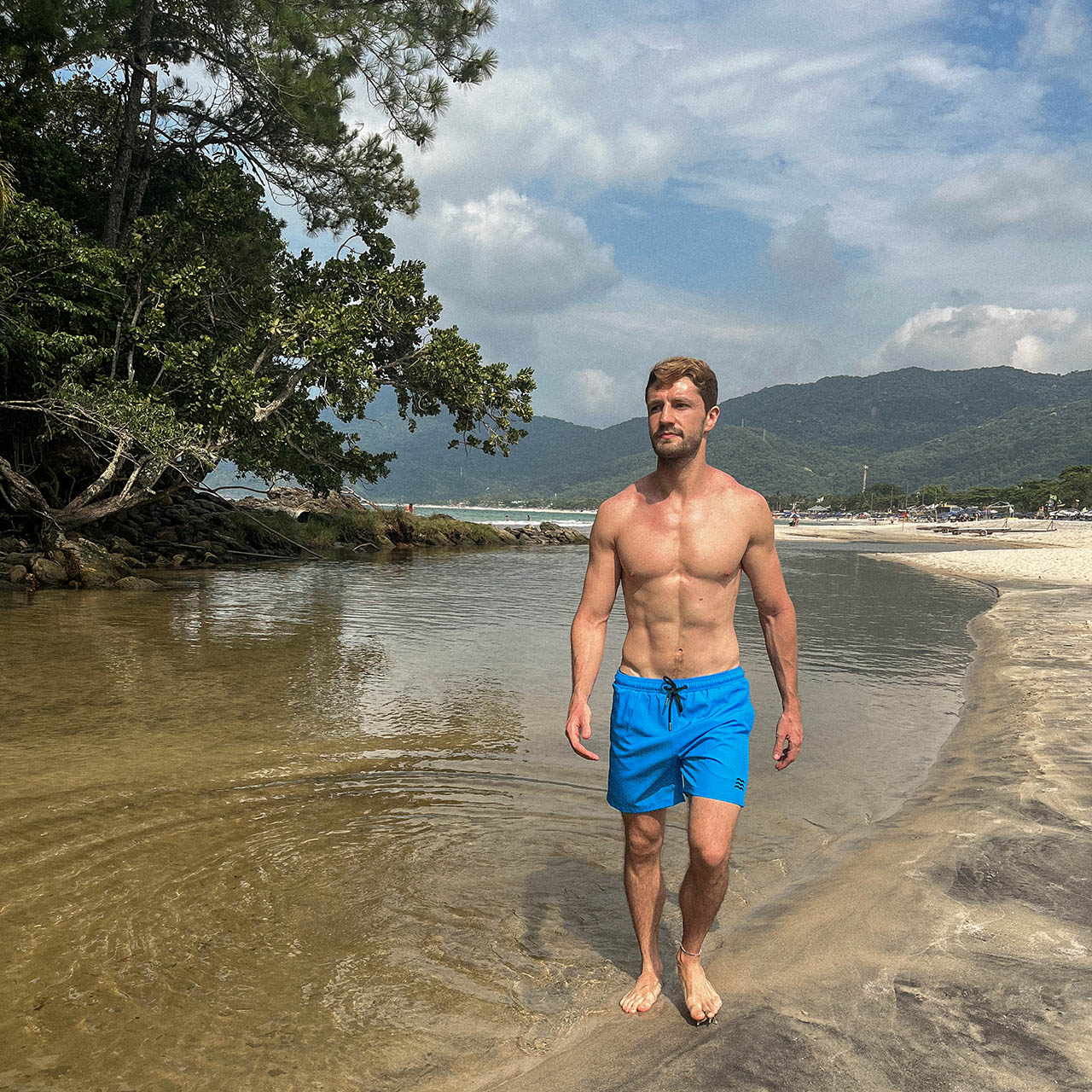 O modelo tem 1,79m de altura, pesa 76kg e veste tamanho P.